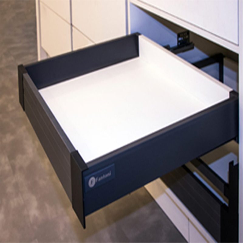 این ریل به گونه ای طراحی شده که ریل دارای بدنه بوده و برای طراحی کشو نیاز به سه قسمت MDF است. دو قسمتی که برای تکمیل کشو نیاز بوده شامل پشت کشو و کف کشو است. قسمت جلویی کشو از جنس آلومینیوم ساخته شده است. برای محاسبه عرض کف کشو باید داخل به داخل یونیت منفی 8 سانتیمتر شود.