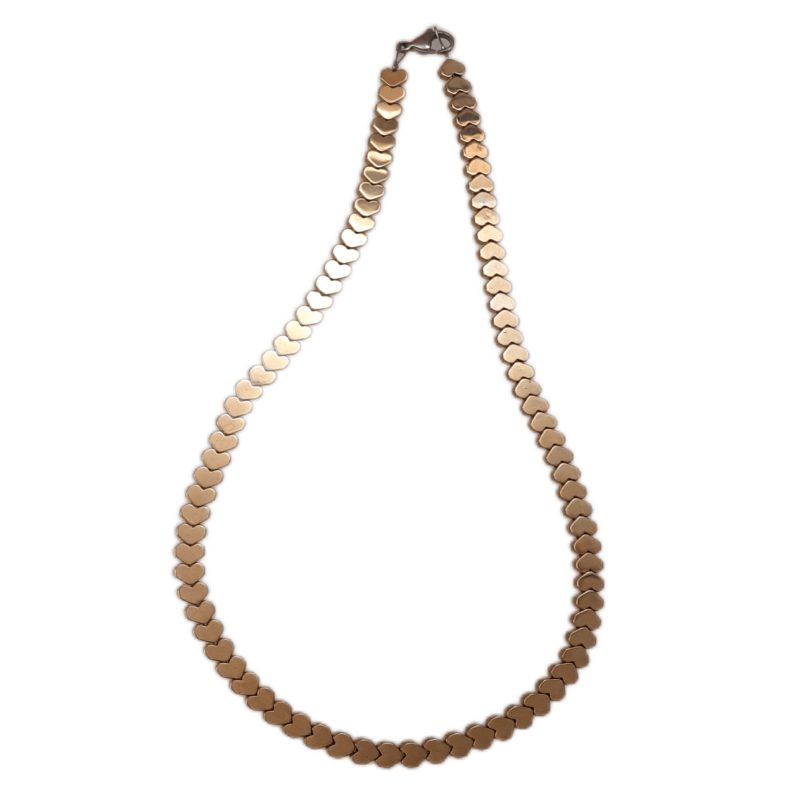 گردنبند سنگ طبیعی حدید (هماتیت) مدل قلبی کد 105 (طلایی براق) از کنار هم قرار گرفتن دانه های سنگ حدید در کنار هم تشکیل شده است.