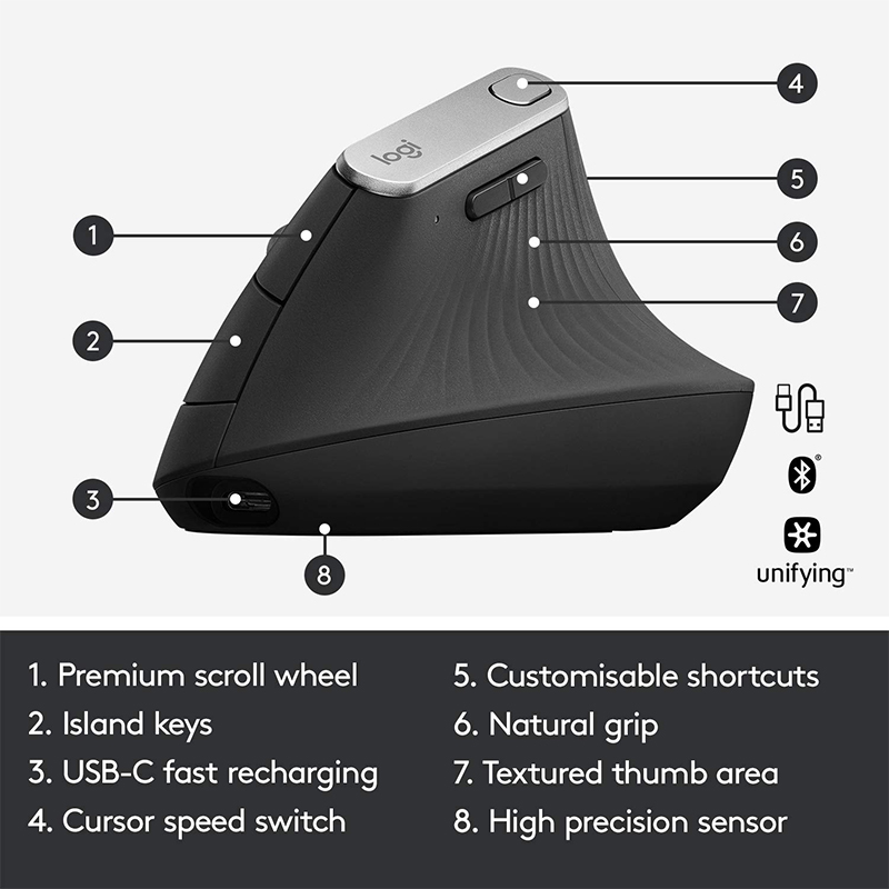 فقط ۱ دقیقه شارژ برای ۳ ساعت استفاده مداوم کافی است.شارژ از طریق پورت USB-C انجام میشود تا هم سریعتر باشد و هم دوام بیشتری داشته باشد.نرمافزار Logi Options+: با نرمافزار اختصاصی لاجیتک، تمام دکمهها و تنظیمات ماوس را مطابق نیاز خود شخصیسازی کنید.از قابلیت Logitech Flow نیز میتوانید برای جابجایی بین چند سیستم بهصورت بیوقفه استفاده کنید — حتی کپی و پیست متن یا فایل بین آنها ممکن است!چرا Logitech MX Vertical را بخریم؟ – طراحی علمی برای کاهش فشار روی مچ – کیفیت ساخت بالا و طراحی چشمنواز – اتصال چندگانه و سازگاری با Windows، macOS و Linux – شارژ سریع و دوام باتری عالی – پشتیبانی از نرمافزار حرفهای Logi Options+
